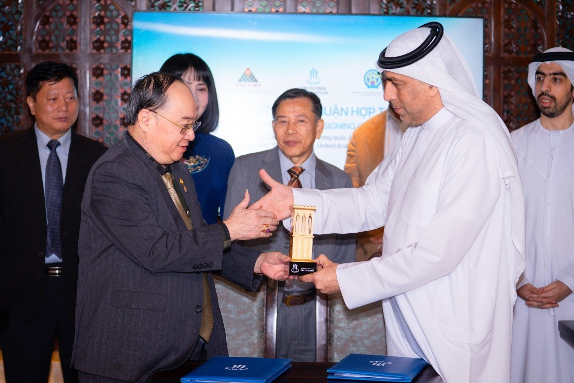 Sau khi đại diện hai bên, Chủ tịch Nguyễn Hồng Sơn và Chủ tịch Dawood Al Shezawi chính thức thực hiện lễ ký kết Biên bản thỏa thuận hợp tác, không khí trở nên ấm áp và trang trọng hơn với phần trao tặng những món quà lưu niệm ý nghĩa. Đây không chỉ là cử chỉ tượng trưng của sự trân trọng lẫn nhau mà còn thể hiện tinh thần hợp tác bền chặt.