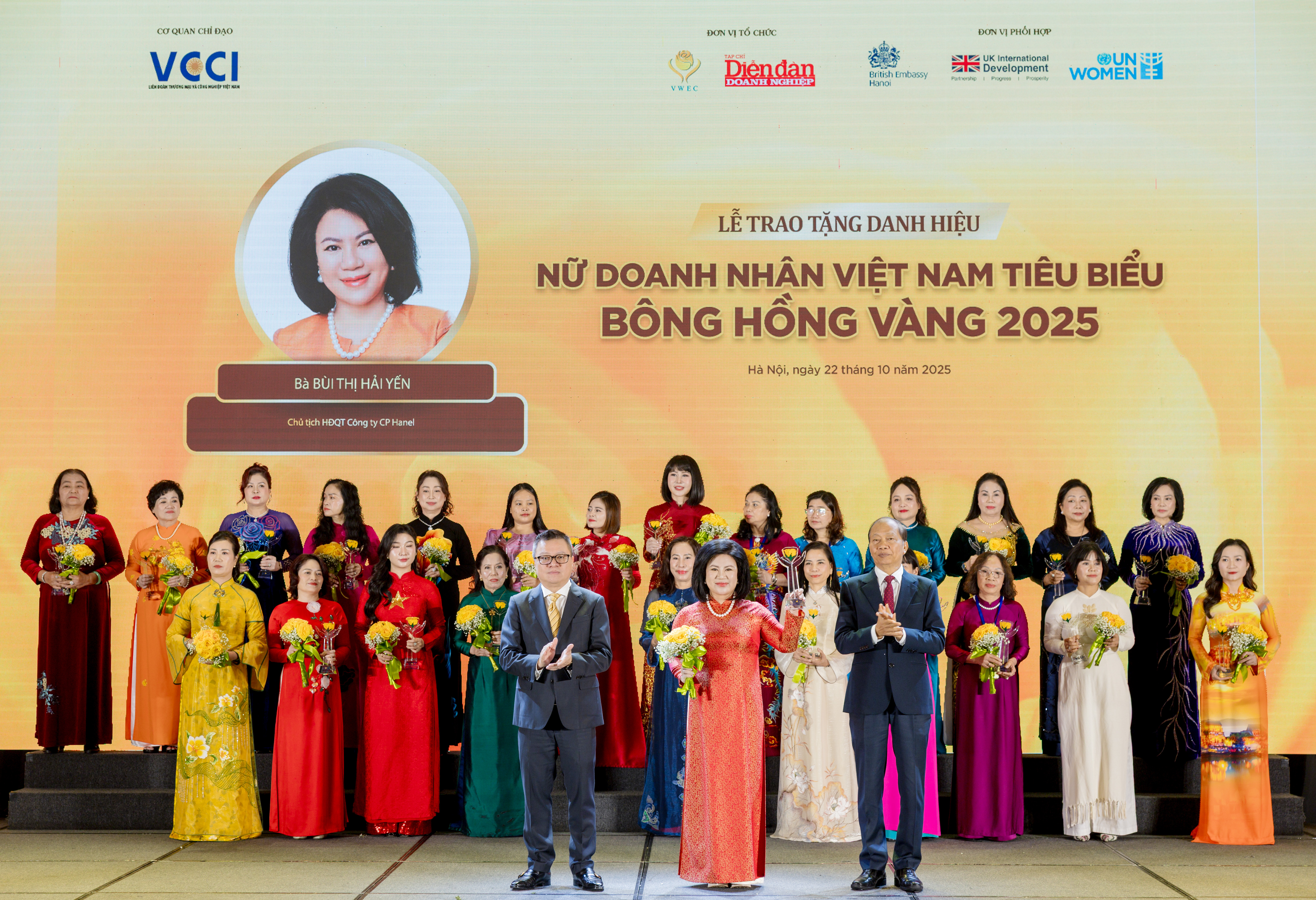 Bà Bùi Thị Hải Yến, Chủ tịch HĐQT Công ty Hanel nhận danh hiệu “Nữ doanh nhân Việt Nam tiêu biểu - Bông hồng vàng“ năm 2025.
