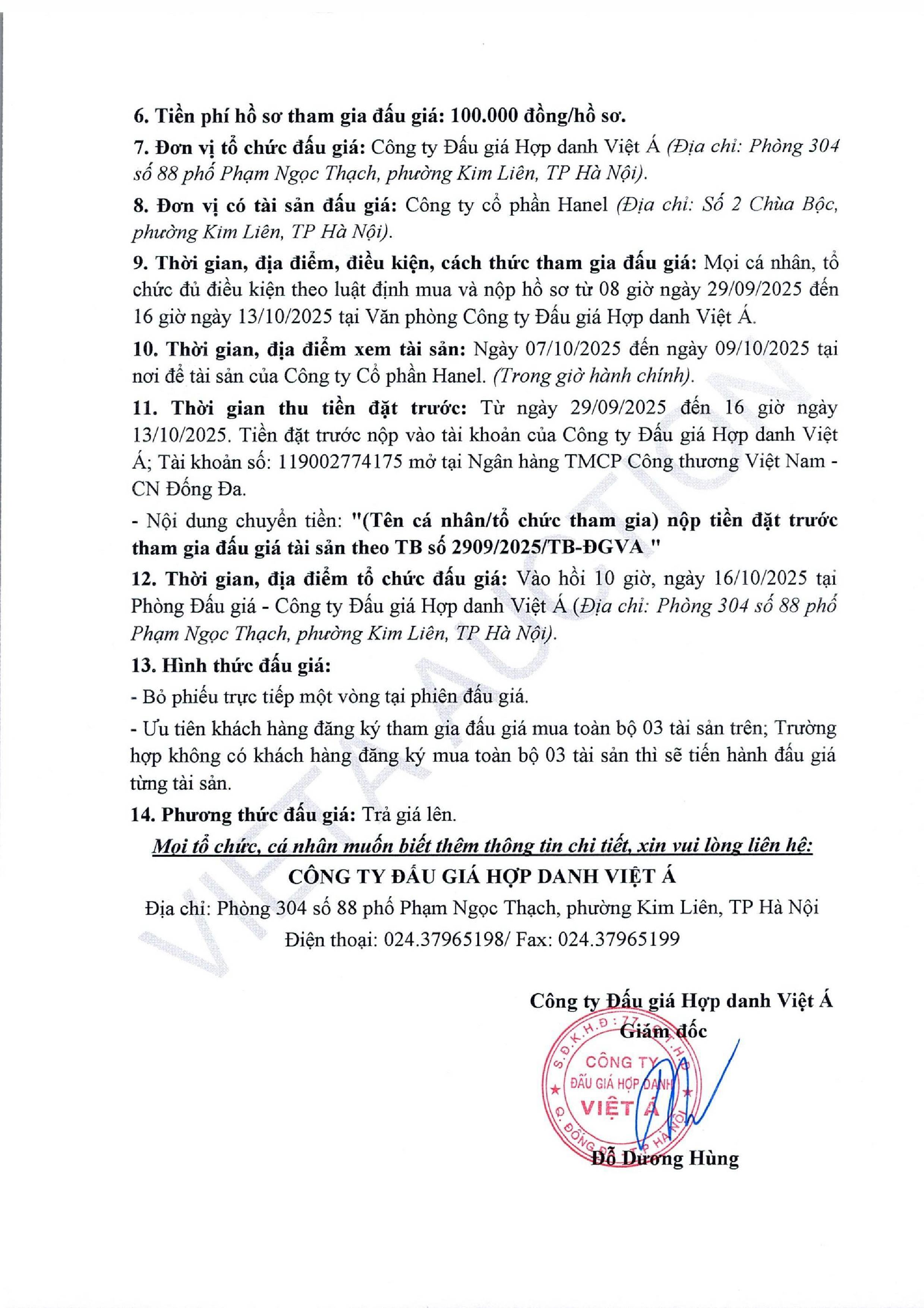 THÔNG BÁO SỐ 2909/2025/TB-ĐGVA VỀ VIỆC THÔNG BÁO ĐẤU GIÁ TÀI SẢN