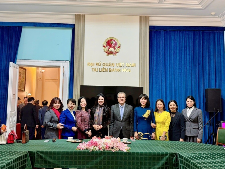 Các nữ doanh nhân chụp ảnh lưu niệm cùng Đại sứ Đặng Minh Khôi trong chuyến thăm Đại sứ quán Việt Nam tại Liên bang Nga